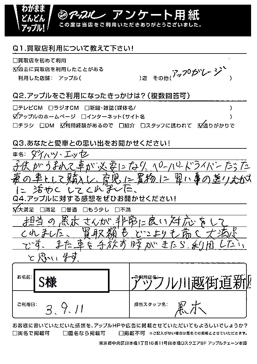 お車のご相談・ 査定だけでもOK! カンタン 入力 30秒 アップルがブランド買取始めました! お電話でも受付中! 受付時間10:00 ~ 19:00 048-478-9411 お車のご相談・ 査定だけでもOK! カンタン 入力 30秒 アップルがブランド買取始めました! お電話でも受付中! 受付時間10:00 ~ 19:00 048-478-9411 アップルがブランド買取始めました! お電話でも受付中! 受付時間10:00 ~ 19:00 048-478-9411 店舗情報 在庫車 スタッフ紹介 ブログ お客様の声 キャンペーン お得 無料査定 click お客様の声 ご記入日: 2021/09/11 S様 車名:ダイハツ エッセ アップルに対する感想をぜひお聞かせください!担当の黒木さんが非常に良い対応をしてくれました。買取額もどこよりも高く大満足です。また車を手放す時が来たら利用したいと思います。 前へ 次へ お客様の声一覧を見る