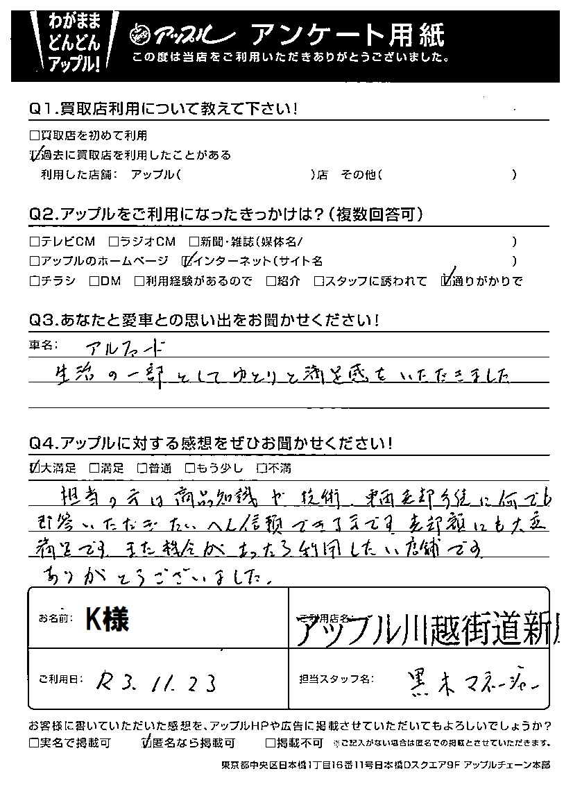 A4 大満足 担当の方は商品知識や技術、車両売却手続きに何でも即答いただきたいへん信頼できる方です。売却額にも大変満足です。また機会があったら利用したい店舗です。ありがとうございました。