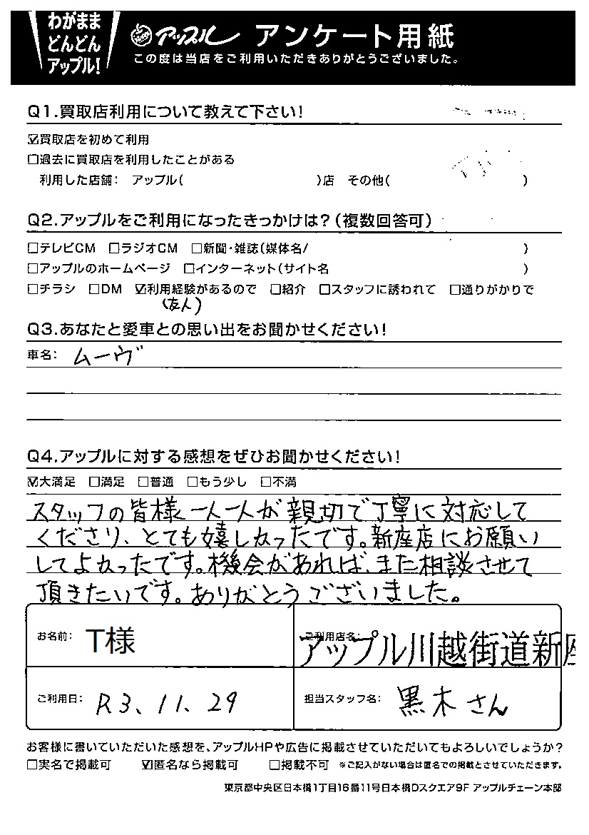 ご利用日:2021/11/29 T様 車名:ダイハツ ムーヴ