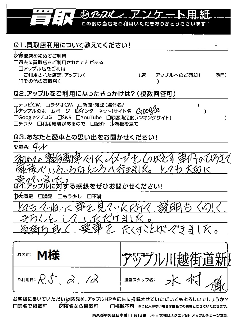 愛車:ダイハツ タント 担当:水村