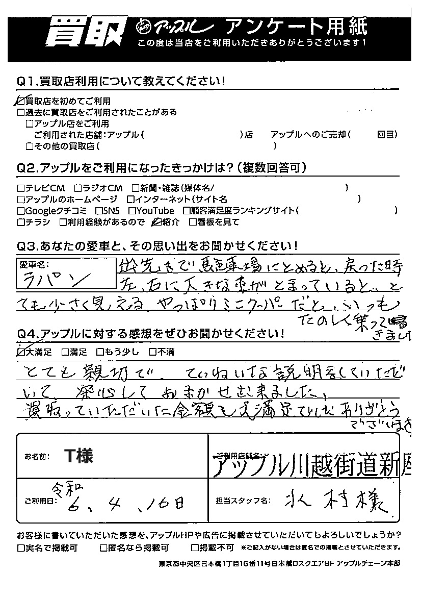 T様 車名:スズキ アルトラパン ラパン(アルト)