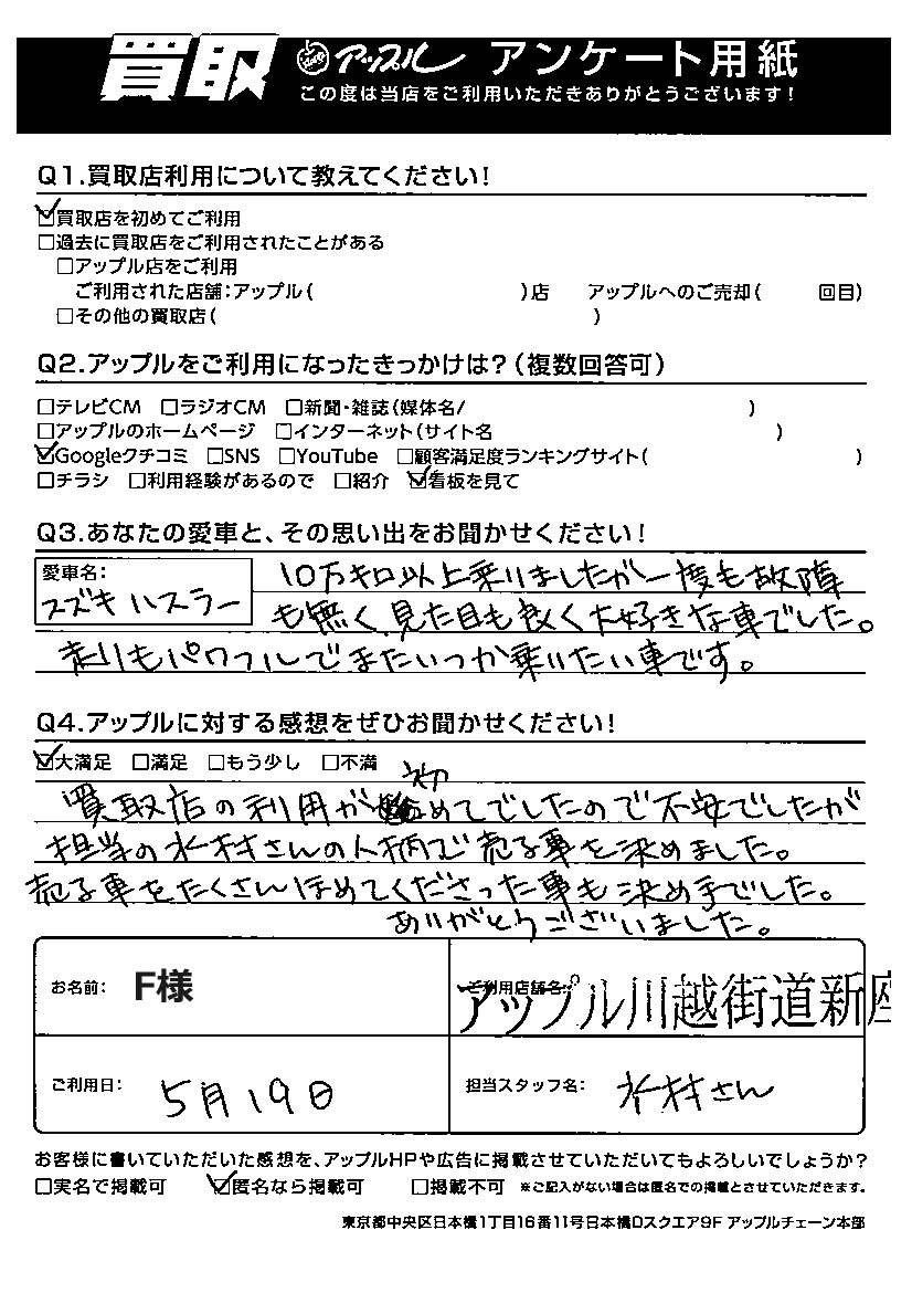 F様 車名:スズキ ハスラー