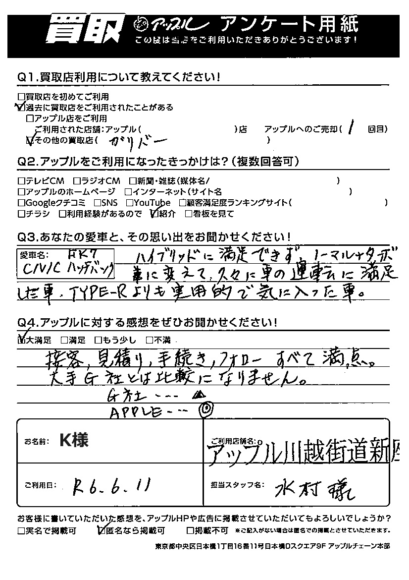 K様 車名:ホンダ シビックハッチバック