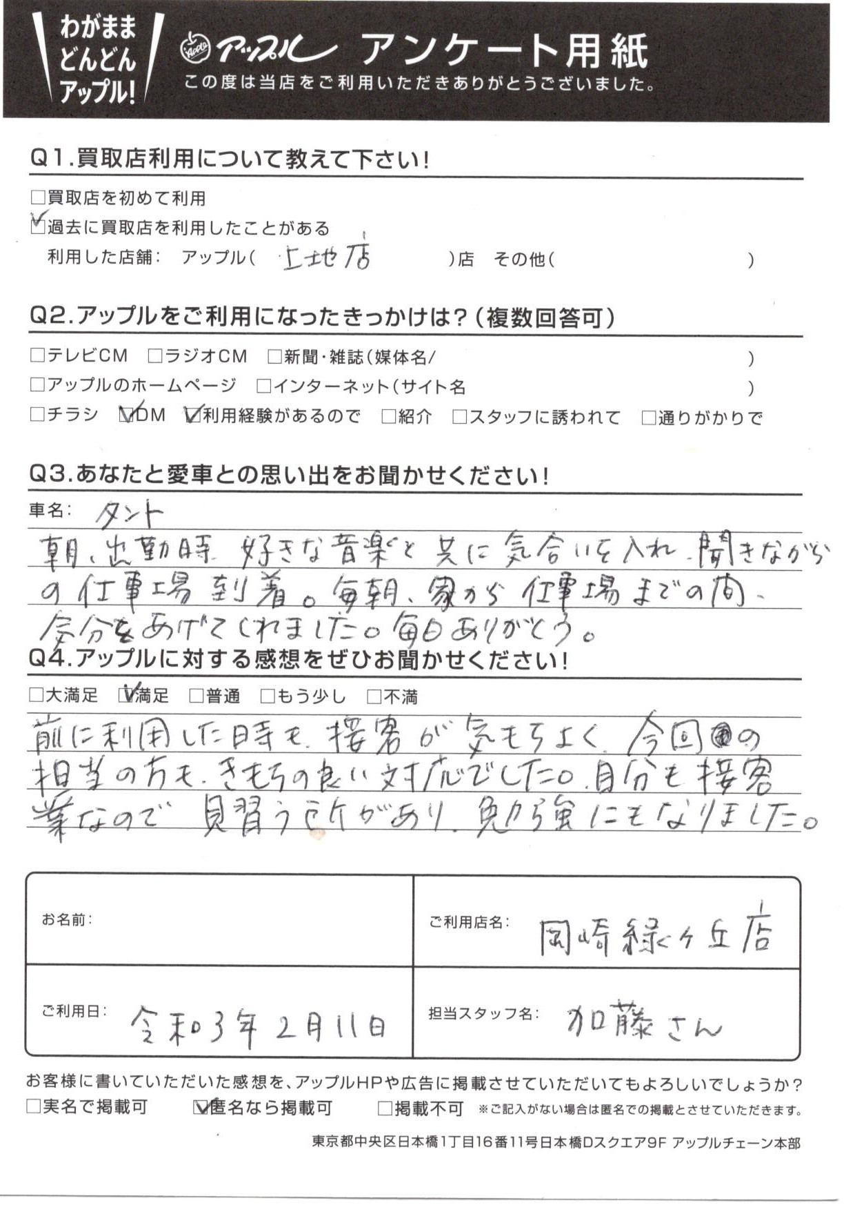 お車のご相談・ 査定だけでもOK! カンタン 入力 30秒 アップルがブランド買取始めました! お電話でも受付中! 受付時間10:00 ~ 19:00 0564-57-0123 お車のご相談・ 査定だけでもOK! カンタン 入力 30秒 アップルがブランド買取始めました! お電話でも受付中! 受付時間10:00 ~ 19:00 0564-57-0123 アップルがブランド買取始めました! お電話でも受付中! 受付時間10:00 ~ 19:00 0564-57-0123 店舗情報 在庫車 スタッフ紹介 ブログ お客様の声 キャンペーン 無料査定 click お客様の声 ご記入日: 2021/02/11 愛知県 匿名希望様 車名:ダイハツ タント 前に利用した時も接客が気持ちよく今回の担当の方、きもちの良い対応でした。自分も接客業なので、見習う所があり、勉強になりました。 前へ 次へ お客様の声一覧を見る