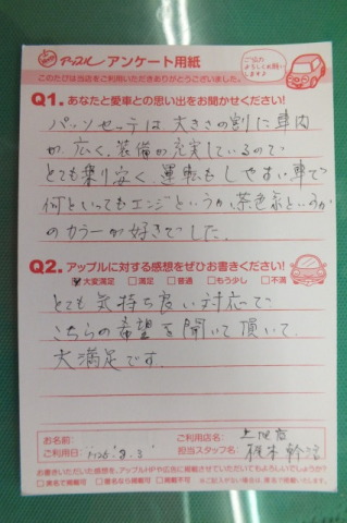 パッソセッテは大きさの割りに車内が広く、装備が充実しているのでとても乗りやすく、運転もしやすい車で何といってもエンジというか茶色系というかのカラーが好きでした。