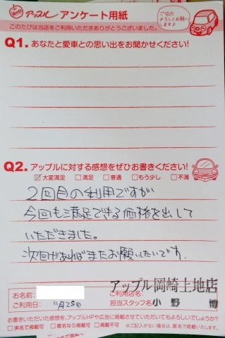 お車のご相談・ 査定だけでもOK! カンタン 入力 30秒 アップルがブランド買取始めました! お電話でも受付中! 受付時間10:00 ~ 19:00 0564-57-0123 お車のご相談・ 査定だけでもOK! カンタン 入力 30秒 アップルがブランド買取始めました! お電話でも受付中! 受付時間10:00 ~ 19:00 0564-57-0123 アップルがブランド買取始めました! お電話でも受付中! 受付時間10:00 ~ 19:00 0564-57-0123 店舗情報 在庫車 スタッフ紹介 ブログ お客様の声 キャンペーン 無料査定 click お客様の声 ご記入日: 2013/11/28 匿名希望様 【アップルに対する感想】2回目の利用ですが今回も満足できる価格を出していただきました。次回があればまたお願いしたいです。 前へ 次へ お客様の声一覧を見る