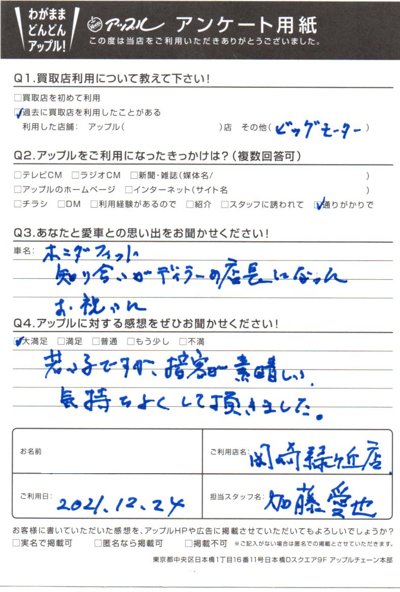 お車のご相談・ 査定だけでもOK! カンタン 入力 30秒 アップルがブランド買取始めました! お電話でも受付中! 受付時間10:00 ~ 19:00 0564-57-0123 お車のご相談・ 査定だけでもOK! カンタン 入力 30秒 アップルがブランド買取始めました! お電話でも受付中! 受付時間10:00 ~ 19:00 0564-57-0123 アップルがブランド買取始めました! お電話でも受付中! 受付時間10:00 ~ 19:00 0564-57-0123 店舗情報 在庫車 スタッフ紹介 ブログ お客様の声 キャンペーン 無料査定 click お客様の声 ご記入日: 2021/12/24 愛知県 匿名希望様 車名:ホンダ フィット(H25年9月以降のハイブリッド含む) 若い子ですが、接客が素晴らしい。気持ちよくして頂きました。 前へ 次へ お客様の声一覧を見る