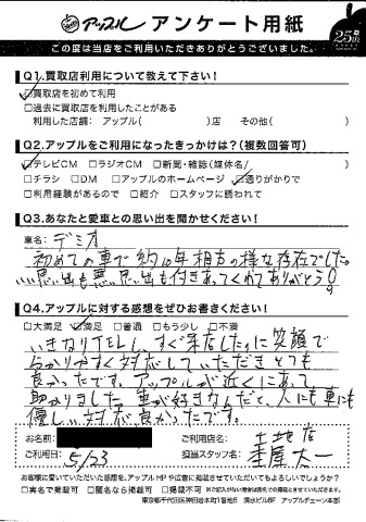 お車のご相談・ 査定だけでもOK! カンタン 入力 30秒 アップルがブランド買取始めました! お電話でも受付中! 受付時間10:00 ~ 19:00 0564-57-0123 お車のご相談・ 査定だけでもOK! カンタン 入力 30秒 アップルがブランド買取始めました! お電話でも受付中! 受付時間10:00 ~ 19:00 0564-57-0123 アップルがブランド買取始めました! お電話でも受付中! 受付時間10:00 ~ 19:00 0564-57-0123 店舗情報 在庫車 スタッフ紹介 ブログ お客様の声 キャンペーン 無料査定 click お客様の声 ご記入日: 2014/05/23 匿名希望様 いきなりTELし、すぐ来店したのに笑顔で分かりやすく対応して頂きとても良かったです。アップルが近くにあって助かりました。車が好きなんだと、人にも車にも優しい対応良かったです。 前へ 次へ お客様の声一覧を見る