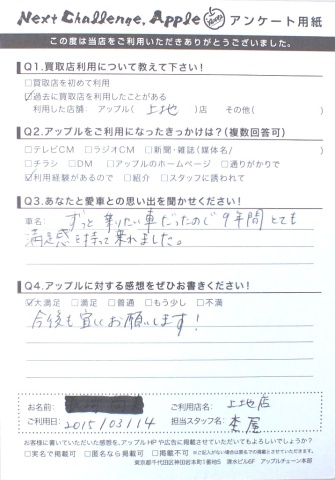 お車のご相談・ 査定だけでもOK! カンタン 入力 30秒 アップルがブランド買取始めました! お電話でも受付中! 受付時間10:00 ~ 19:00 0564-57-0123 お車のご相談・ 査定だけでもOK! カンタン 入力 30秒 アップルがブランド買取始めました! お電話でも受付中! 受付時間10:00 ~ 19:00 0564-57-0123 アップルがブランド買取始めました! お電話でも受付中! 受付時間10:00 ~ 19:00 0564-57-0123 店舗情報 在庫車 スタッフ紹介 ブログ お客様の声 キャンペーン 無料査定 click お客様の声 ご記入日: 2015/03/14 匿名希望様 ★あなたと愛車との思い出を聞かせて下さいずっと乗りたい車だったので9年間とても満足感を持って乗れました。★アップルに対する感想をぜひお書きください今後も宜しくお願いします! 前へ 次へ お客様の声一覧を見る