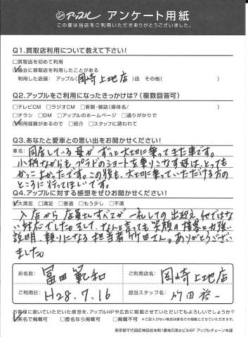 Q2.アップルに対する感想をお書きください!・・・入店から店員さんすべてが一礼しての出迎え、他ではない対応でした。そして、なんと言っても笑顔の接客と力強い説明、頼りになる担当者竹田さん。ありがとうございました。