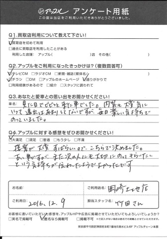 Q2.アップルに対する感想をお聞かせください!・・・接客が大変すばらしいのでこちらで決めました。古い車ですが、また次の人にも大切にのってもらいたいという気持ちが伝わったようでよかったです。