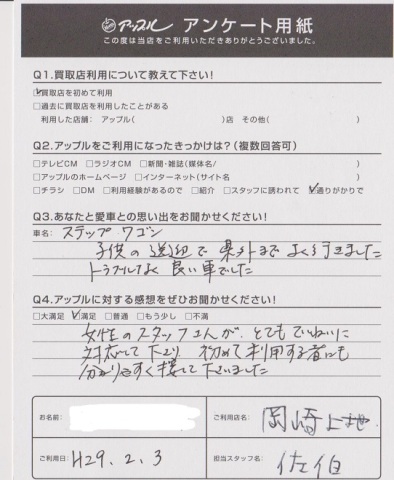 Q1.愛車との思い出をお聞かせください!・・・子供の送迎で県外までよく行きました。トラブルなく良い車でした。