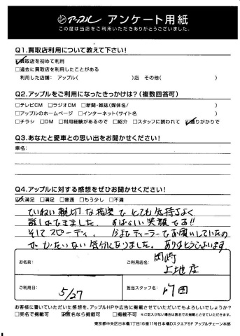 Q.アップルに対する感想をぜひお聞かせください!・・・ていねい親切な接客でとても気持ちよく話ができました。すばらしい笑顔です!!そしてスピーディ。今までディーラーでお願いしていたのがもったいない気分になりました。ありがとうございます。