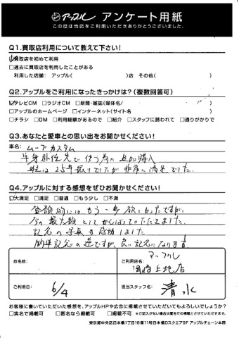 Q2.アップルに対する感想をお聞かせください!・・・金額的にはもう一歩欲しかったですが、今の最大額としてがんばっていただきました。記念の写真も感動しました。納車記念の逆ですが、良い記念になります。