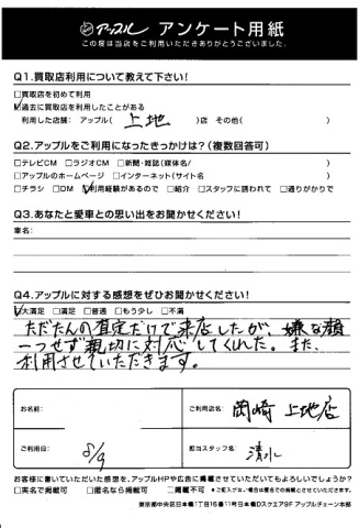 お車のご相談・ 査定だけでもOK! カンタン 入力 30秒 アップルがブランド買取始めました! お電話でも受付中! 受付時間10:00 ~ 19:00 0564-57-0123 お車のご相談・ 査定だけでもOK! カンタン 入力 30秒 アップルがブランド買取始めました! お電話でも受付中! 受付時間10:00 ~ 19:00 0564-57-0123 アップルがブランド買取始めました! お電話でも受付中! 受付時間10:00 ~ 19:00 0564-57-0123 店舗情報 在庫車 スタッフ紹介 ブログ お客様の声 キャンペーン 無料査定 click お客様の声 ご記入日: 2017/08/09 岡崎市 T様 Q1.アップルに対する感想をお聞かせください!・・・ただたんの査定だけで来店したが、嫌な顔一つせず親切に対応してくれた。また利用させていただきます。担当スタッフ:清水 前へ 次へ お客様の声一覧を見る