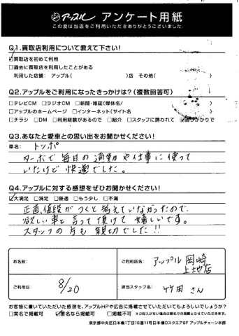 Q2.アップルに対する感想をお聞かせください!・・・正直、値段がつくと考えていなかったので、欲しい車と言って頂けて嬉しいです。スタッフの方も親切でした!!