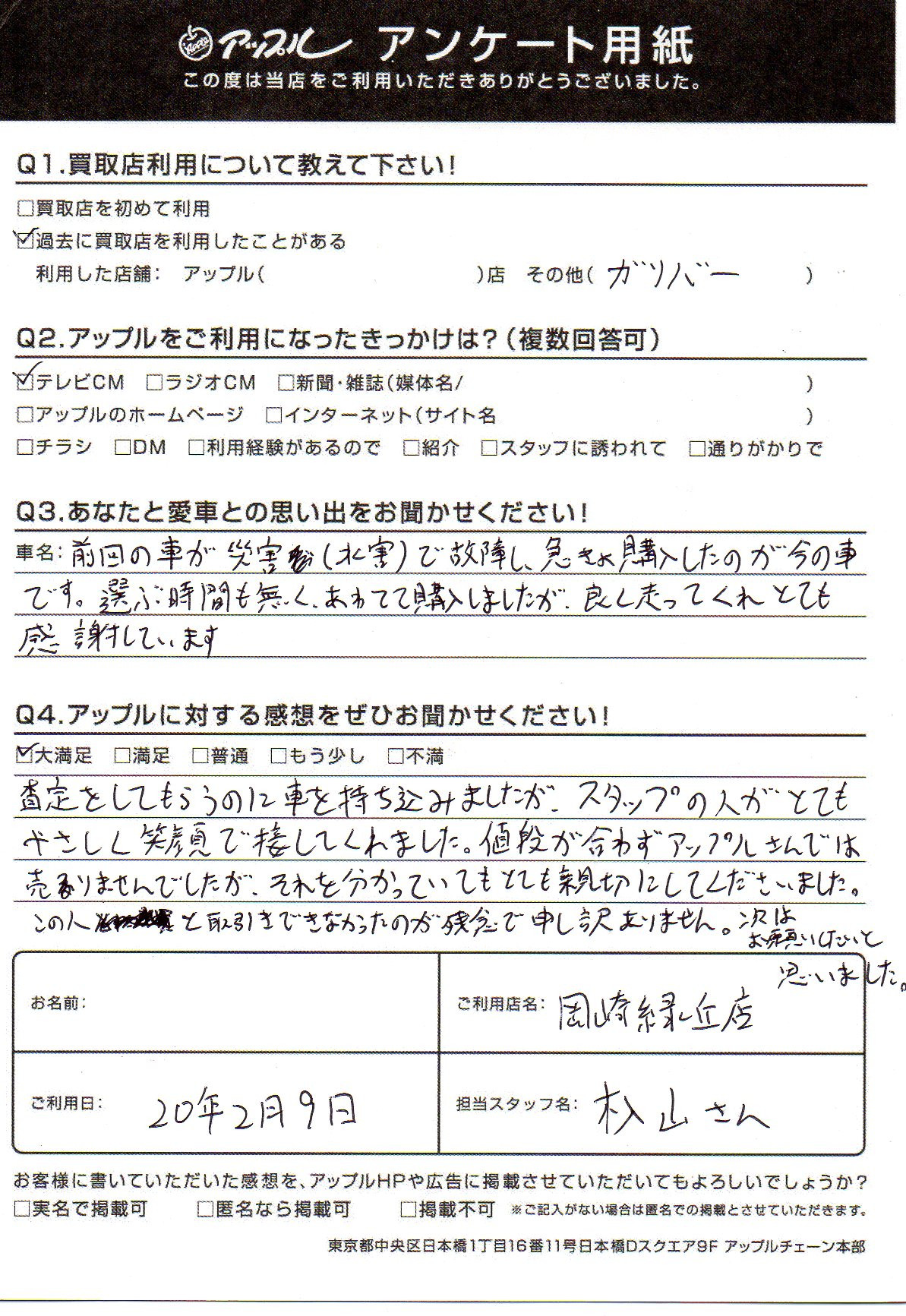 査定をしてもらうのに車を持ち込みましたが、スタッフの人がとてもやさしく笑顔で接してくれました。値段が合わずアップルさんでは売りませんでしたが、それを分かっていてもとても親切にしてくださいました。この人と取引できなかったのが残念で申し訳ありません。次はお願いしたいと思いました。