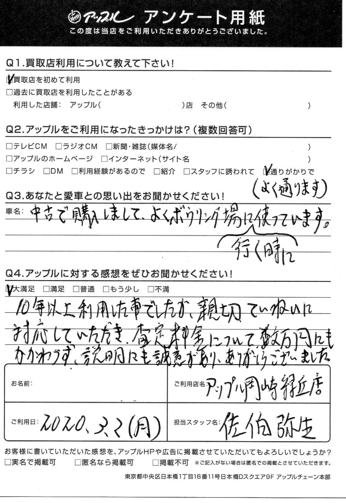 お車のご相談・ 査定だけでもOK! カンタン 入力 30秒 アップルがブランド買取始めました! お電話でも受付中! 受付時間10:00 ~ 19:00 0564-57-0123 お車のご相談・ 査定だけでもOK! カンタン 入力 30秒 アップルがブランド買取始めました! お電話でも受付中! 受付時間10:00 ~ 19:00 0564-57-0123 アップルがブランド買取始めました! お電話でも受付中! 受付時間10:00 ~ 19:00 0564-57-0123 店舗情報 在庫車 スタッフ紹介 ブログ お客様の声 キャンペーン 無料査定 click お客様の声 ご記入日: 2020/03/02 愛知県 匿名希望様 10年以上利用した車でしたが、親切ていねいに対応して頂き、査定金額について、数万円にもかかわらず、説明にも誠意があり、ありがとうございました。 前へ 次へ お客様の声一覧を見る