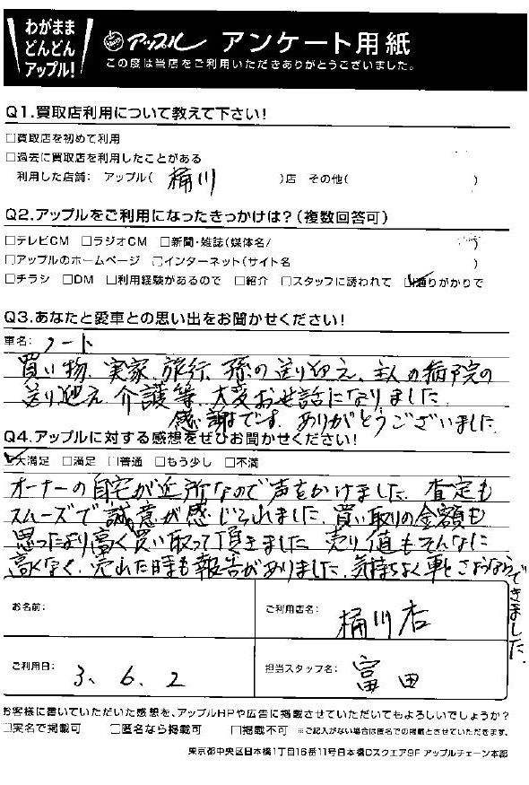 買い物、実家、旅行、孫の送り迎え、主人の病院の送り迎え、介護等、大変お世話になりました。感謝です。ありがとうございました。