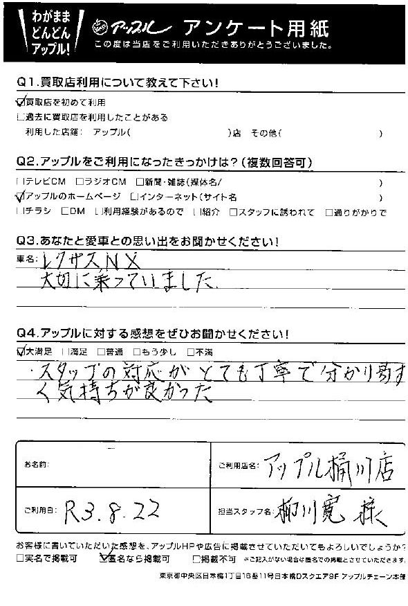 お車のご相談・ 査定だけでもOK! カンタン 入力 30秒 アップルがブランド買取始めました! お電話でも受付中! 受付時間9:30 ~ 19:00 048-783-2474 お車のご相談・ 査定だけでもOK! カンタン 入力 30秒 アップルがブランド買取始めました! お電話でも受付中! 受付時間9:30 ~ 19:00 048-783-2474 アップルがブランド買取始めました! お電話でも受付中! 受付時間9:30 ~ 19:00 048-783-2474 店舗情報 在庫車 スタッフ紹介 ブログ お客様の声 キャンペーン 無料査定 click お客様の声 ご記入日: 2021/08/22 N様 車名:レクサス NX (国内仕様 右H) ・あなたと愛車の思い出大切に乗っていました。・アップルに対する感想スタッフの対応がとても丁寧で分かり易く気持ちが良かった。 前へ 次へ お客様の声一覧を見る