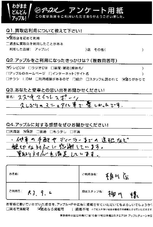 お車のご相談・ 査定だけでもOK! カンタン 入力 30秒 アップルがブランド買取始めました! お電話でも受付中! 受付時間9:30 ~ 19:00 048-783-2474 お車のご相談・ 査定だけでもOK! カンタン 入力 30秒 アップルがブランド買取始めました! お電話でも受付中! 受付時間9:30 ~ 19:00 048-783-2474 アップルがブランド買取始めました! お電話でも受付中! 受付時間9:30 ~ 19:00 048-783-2474 店舗情報 在庫車 スタッフ紹介 ブログ お客様の声 キャンペーン 無料査定 click お客様の声 ご記入日: 2021/09/02 S様 車名:スズキ スイフト ・あなたと愛車の思い出久しぶりのマニュアル車で楽しかったです。・アップルに対する感想代車の手配やディーラーまでの送迎など親切な対応に感謝しています。買取り対応も満足しています。 前へ 次へ お客様の声一覧を見る
