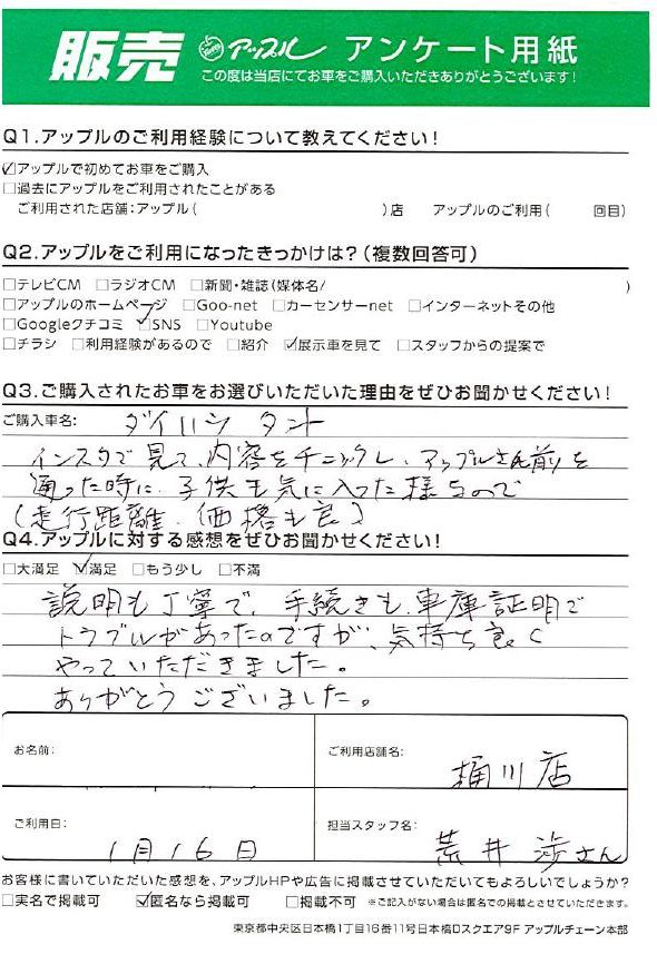 説明も丁寧で、手続きも車庫証明でトラブルがあったのですが、気持ち良くやっていただきました。ありがとうございました。
