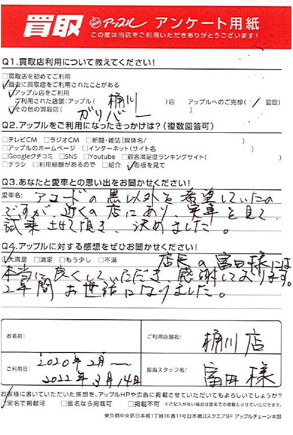 H様 車名:ホンダ アコードセダン(H28年5月~のHYBRID含む)