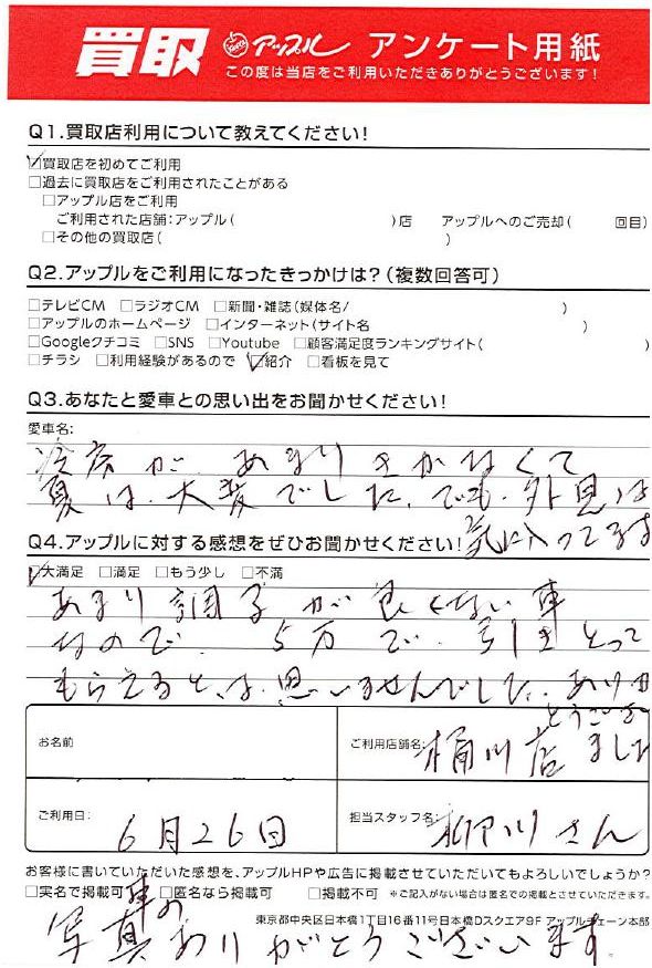 あまり調子が良くない車なので、5万で引き取ってもらえるとは思いませんでした。ありがとうございました。車の写真ありがとうございます。