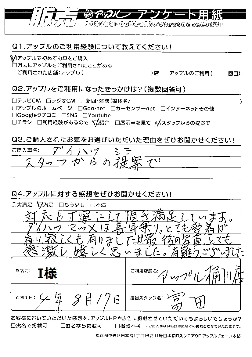 対応も丁寧にして頂き満足しています。ダイハツMAXは長年乗り、とても愛着が有り、寂しくも有りました。最後の写真、とても感激し嬉しく思いました。有難うございました。