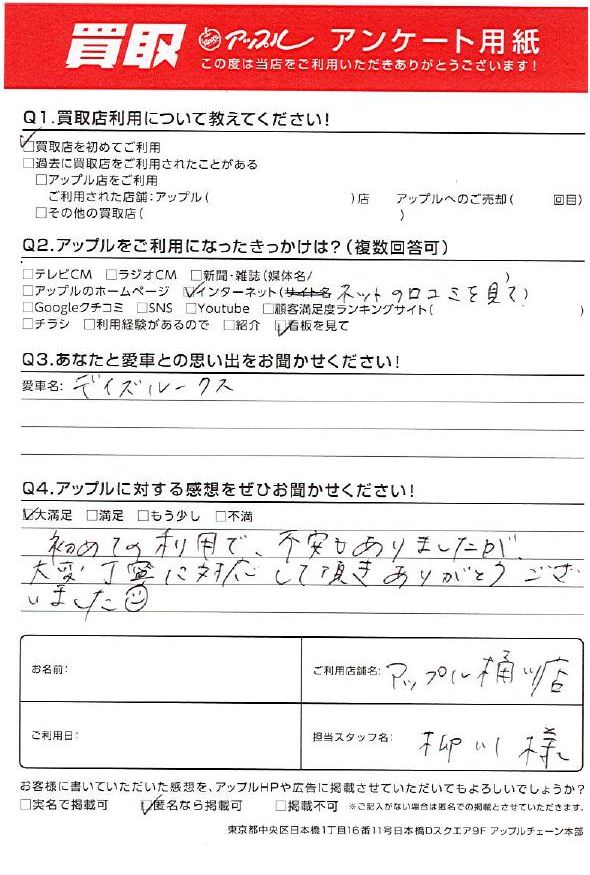 お車のご相談・ 査定だけでもOK! カンタン 入力 30秒 アップルがブランド買取始めました! お電話でも受付中! 受付時間9:30 ~ 19:00 048-783-2474 お車のご相談・ 査定だけでもOK! カンタン 入力 30秒 アップルがブランド買取始めました! お電話でも受付中! 受付時間9:30 ~ 19:00 048-783-2474 アップルがブランド買取始めました! お電話でも受付中! 受付時間9:30 ~ 19:00 048-783-2474 店舗情報 在庫車 スタッフ紹介 ブログ お客様の声 キャンペーン 無料査定 click お客様の声 ご記入日: 2022/10/15 K様 車名:日産 デイズルークス ・アップルに対する感想初めての利用で、不安もありましたが、大変丁寧に対応して頂きありがとうございました。 前へ 次へ お客様の声一覧を見る