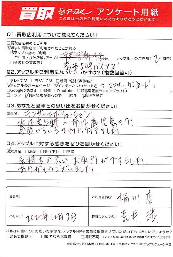 お車のご相談・ 査定だけでもOK! カンタン 入力 30秒 アップルがブランド買取始めました! お電話でも受付中! 受付時間9:30 ~ 19:00 048-783-2474 お車のご相談・ 査定だけでもOK! カンタン 入力 30秒 アップルがブランド買取始めました! お電話でも受付中! 受付時間9:30 ~ 19:00 048-783-2474 アップルがブランド買取始めました! お電話でも受付中! 受付時間9:30 ~ 19:00 048-783-2474 店舗情報 在庫車 スタッフ紹介 ブログ お客様の声 キャンペーン 無料査定 click お客様の声 ご記入日: 2022/12/03 K様 車名:三菱 ランサーエボリューション ・あなたと愛車の思い出北は宗谷岬~南は鹿児島まで、全国いろいろな所に行きました。・アップルに対する感想気持ちの良いお取引ができました。ありがとうございました。 前へ 次へ お客様の声一覧を見る