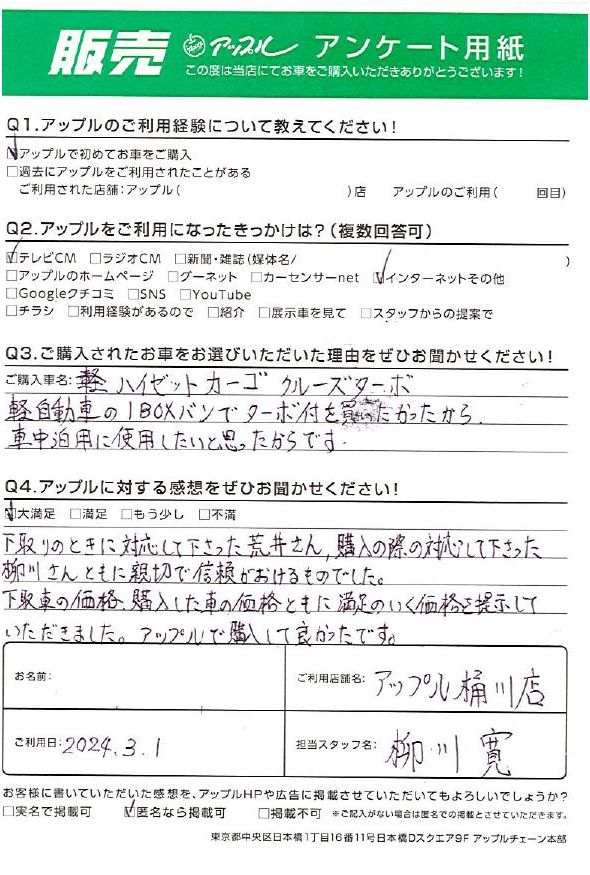 下取車の価格・購入した車の価格ともに満足のいく価格を提示していただきました。アップルで購入して良かったです。