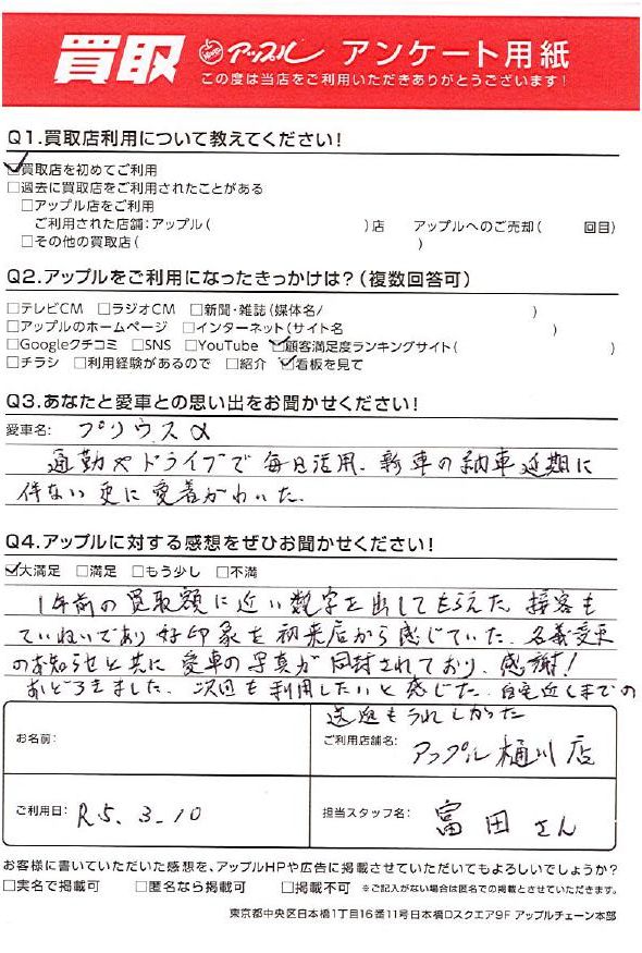 1年前の買取額に近い数字を出してもらえた。接客もていねいであり好印象を初来店から感じていた。名義変更のお知らせと共に愛車の写真が同封しており感謝!おどろきました。次回も利用したいと感じた。自宅近くまでの送迎もうれしかった。