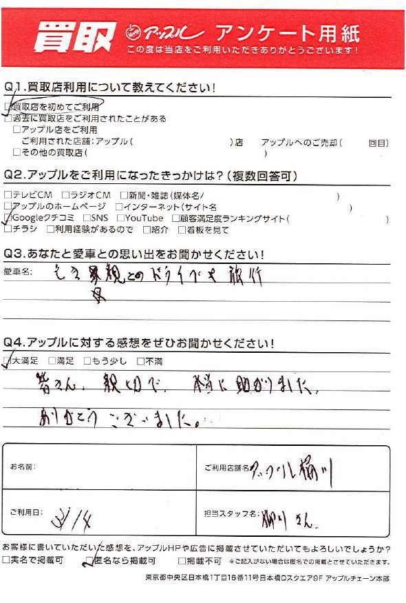 お車のご相談・ 査定だけでもOK! カンタン 入力 30秒 アップルがブランド買取始めました! お電話でも受付中! 受付時間9:30 ~ 19:00 048-783-2474 お車のご相談・ 査定だけでもOK! カンタン 入力 30秒 アップルがブランド買取始めました! お電話でも受付中! 受付時間9:30 ~ 19:00 048-783-2474 アップルがブランド買取始めました! お電話でも受付中! 受付時間9:30 ~ 19:00 048-783-2474 店舗情報 在庫車 スタッフ紹介 ブログ お客様の声 キャンペーン 無料査定 click お客様の声 ご記入日: 2023/03/14 I様 車名:トヨタ ist ・あなたと愛車の思い出亡き母親とのドライブや旅行・アップルに対する感想皆さん、親切で本当に助かりました。ありがとうございました。 前へ 次へ お客様の声一覧を見る