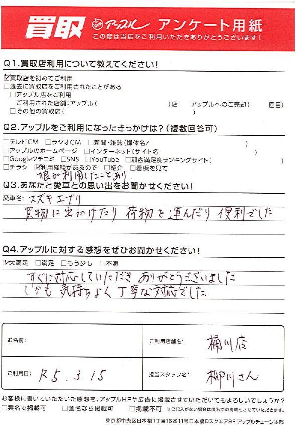 お車のご相談・ 査定だけでもOK! カンタン 入力 30秒 アップルがブランド買取始めました! お電話でも受付中! 受付時間9:30 ~ 19:00 048-783-2474 お車のご相談・ 査定だけでもOK! カンタン 入力 30秒 アップルがブランド買取始めました! お電話でも受付中! 受付時間9:30 ~ 19:00 048-783-2474 アップルがブランド買取始めました! お電話でも受付中! 受付時間9:30 ~ 19:00 048-783-2474 店舗情報 在庫車 スタッフ紹介 ブログ お客様の声 キャンペーン 無料査定 click お客様の声 ご記入日: 2023/03/15 I様 車名:スズキ エブリイ ・あなたと愛車の思い出買い物に出かけたり荷物も運んだり便利でした。・アップルに対する感想すぐに対応していただきありがとうございました。しかも気持ちよく丁寧な対応でした。 前へ 次へ お客様の声一覧を見る