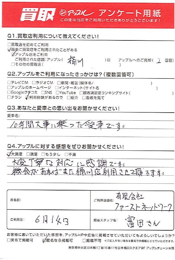 お車のご相談・ 査定だけでもOK! カンタン 入力 30秒 アップルがブランド買取始めました! お電話でも受付中! 受付時間9:30 ~ 19:00 048-783-2474 お車のご相談・ 査定だけでもOK! カンタン 入力 30秒 アップルがブランド買取始めました! お電話でも受付中! 受付時間9:30 ~ 19:00 048-783-2474 アップルがブランド買取始めました! お電話でも受付中! 受付時間9:30 ~ 19:00 048-783-2474 店舗情報 在庫車 スタッフ紹介 ブログ お客様の声 キャンペーン 無料査定 click お客様の声 ご記入日: 2023/06/14 S様 車名:三菱 デリカD:5 ・あなたと愛車の思い出10年間大事に乗った愛車です。・アップルに対する感想大変丁寧な対応に感謝です。機会があればまた桶川店利用させて頂きます。 前へ 次へ お客様の声一覧を見る