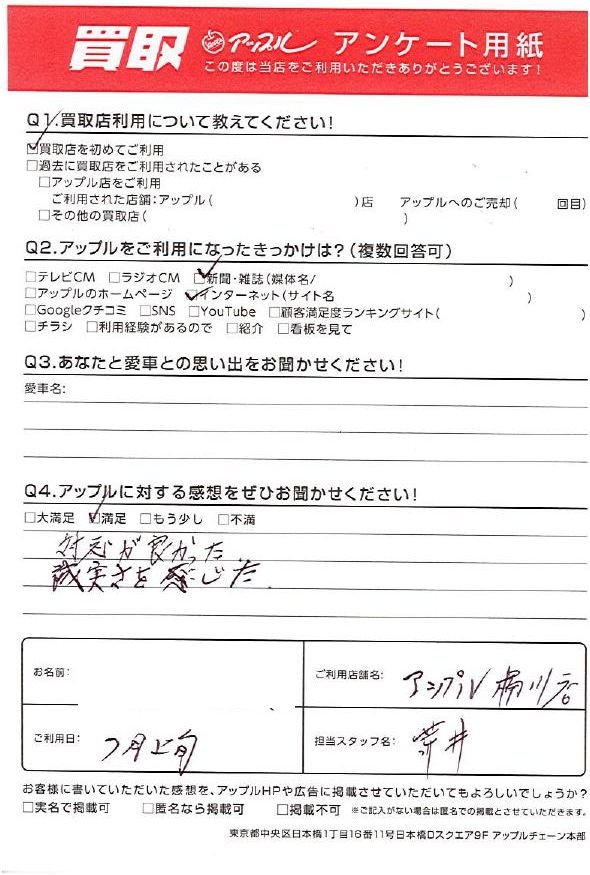お車のご相談・ 査定だけでもOK! カンタン 入力 30秒 アップルがブランド買取始めました! お電話でも受付中! 受付時間9:30 ~ 19:00 048-783-2474 お車のご相談・ 査定だけでもOK! カンタン 入力 30秒 アップルがブランド買取始めました! お電話でも受付中! 受付時間9:30 ~ 19:00 048-783-2474 アップルがブランド買取始めました! お電話でも受付中! 受付時間9:30 ~ 19:00 048-783-2474 店舗情報 在庫車 スタッフ紹介 ブログ お客様の声 キャンペーン 無料査定 click お客様の声 ご記入日: 2023/06/28 H様 車名:スズキ ワゴンR ・アップルに対する感想対応が良かった。誠実さを感じた。 前へ 次へ お客様の声一覧を見る