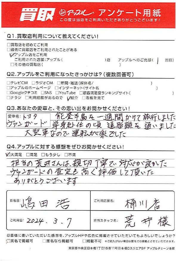 担当の荒井さんは、親切丁寧で対応が良かった。ヴァンガードの査定も高く評価して頂いた。ありがとうございます。