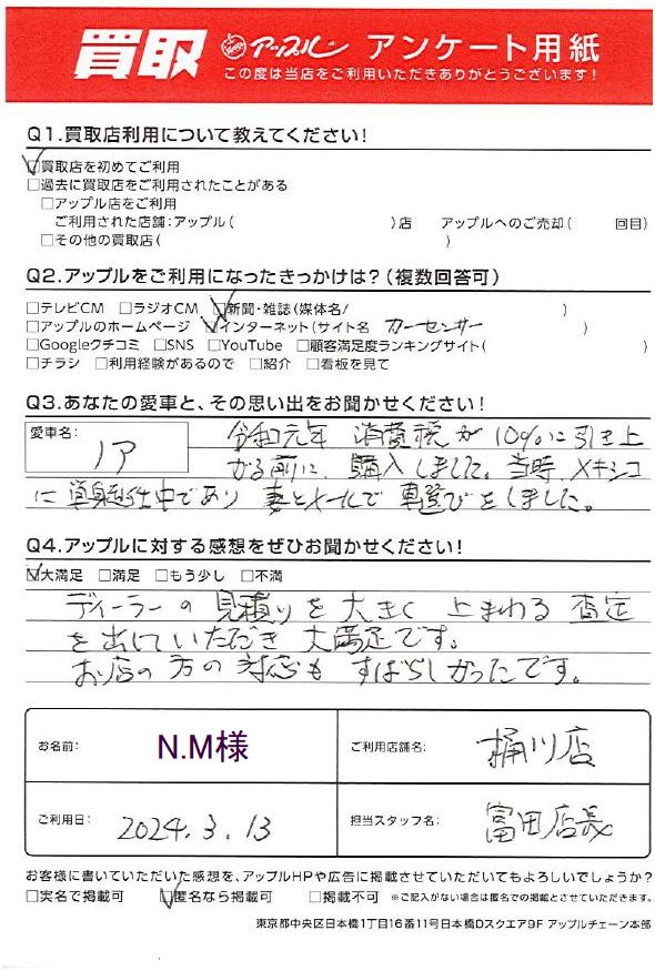 ディーラーの見積りを大きく上回る査定を出していただき大満足です。お店の方の対応も素晴らしかったです。