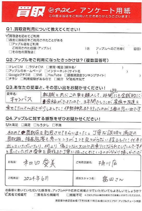 初めて買取店を利用させてもらいました。丁寧な説明と満足の買取額、接客態度も悪いところが1つも見つからない程でした!代車も出していただいたり、何より「傷1つなく大切にお乗りになられていたんですね」と言っていただき愛車を最後まで丁寧に扱ってくれているのが分かり嬉しかったです。