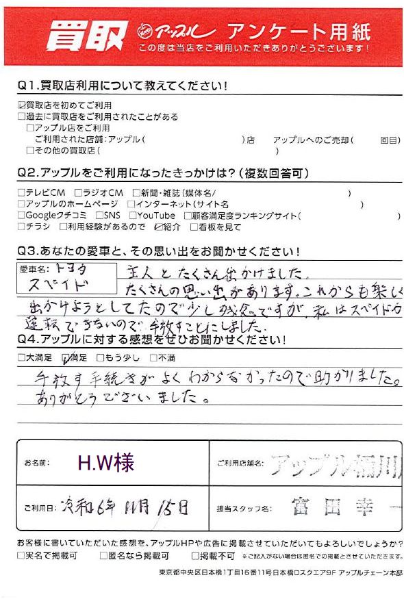 埼玉県上尾市 H.W様 車名:トヨタ スペイド