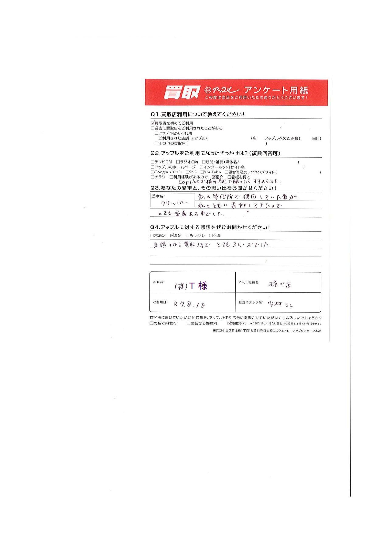 お車のご相談・ 査定だけでもOK! カンタン 入力 30秒 アップルがブランド買取始めました! お電話でも受付中! 受付時間9:30 ~ 19:00 048-783-2474 お車のご相談・ 査定だけでもOK! カンタン 入力 30秒 アップルがブランド買取始めました! お電話でも受付中! 受付時間9:30 ~ 19:00 048-783-2474 アップルがブランド買取始めました! お電話でも受付中! 受付時間9:30 ~ 19:00 048-783-2474 店舗情報 在庫車 スタッフ紹介 ブログ お客様の声 キャンペーン 無料査定 click お客様の声 ご記入日: 2025/08/21 埼玉県さいたま市大宮区 株式会社T様 車名:日産 クリッパー ・あなたの愛車との思い出前の管理所で使用していた車が私と共に移動してきたので、とても愛着ある車でした。・アップルに対する感想見積りから買取までとてもスムースでした。 前へ 次へ お客様の声一覧を見る