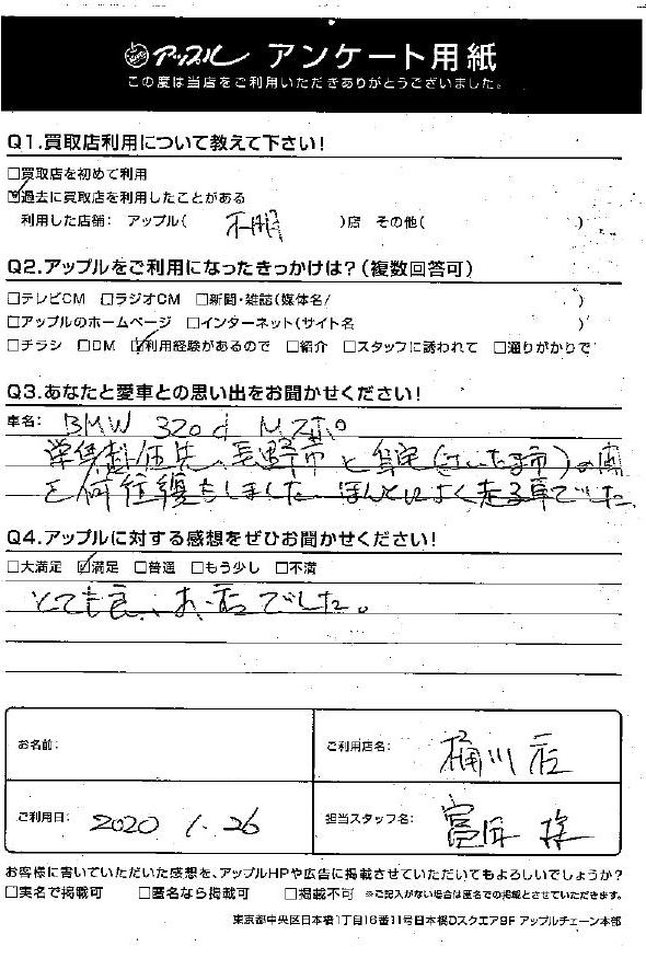 お車のご相談・ 査定だけでもOK! カンタン 入力 30秒 アップルがブランド買取始めました! お電話でも受付中! 受付時間9:30 ~ 19:00 048-783-2474 お車のご相談・ 査定だけでもOK! カンタン 入力 30秒 アップルがブランド買取始めました! お電話でも受付中! 受付時間9:30 ~ 19:00 048-783-2474 アップルがブランド買取始めました! お電話でも受付中! 受付時間9:30 ~ 19:00 048-783-2474 店舗情報 在庫車 スタッフ紹介 ブログ お客様の声 キャンペーン 無料査定 click お客様の声 ご記入日: 2020/01/26 N様 車名:BMW 3シリーズセダン ・あなたと愛車の思い出単身赴任先、長野市と自宅(さいたま市)の間を何往復もしました。ほんとによく走る車でした。・アップルに対する感想とても良いお店でした。 前へ 次へ お客様の声一覧を見る