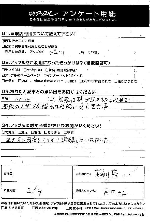 お車のご相談・ 査定だけでもOK! カンタン 入力 30秒 アップルがブランド買取始めました! お電話でも受付中! 受付時間9:30 ~ 19:00 048-783-2474 お車のご相談・ 査定だけでもOK! カンタン 入力 30秒 アップルがブランド買取始めました! お電話でも受付中! 受付時間9:30 ~ 19:00 048-783-2474 アップルがブランド買取始めました! お電話でも受付中! 受付時間9:30 ~ 19:00 048-783-2474 店舗情報 在庫車 スタッフ紹介 ブログ お客様の声 キャンペーン 無料査定 click お客様の声 ご記入日: 2020/02/09 I様 車名:ホンダ N-ONE ・あなたと愛車の思い出ALL無限仕様が日本初との事で、無限の人が5人程納車時に見にきた事。・アップルに対する感想車の良い部分をしっかり理解していただいた。 前へ 次へ お客様の声一覧を見る