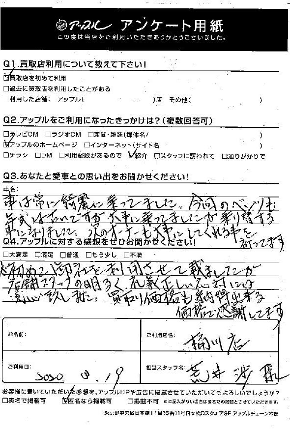 初めて御社を利用させて戴きましたが店舗スタッフの明るく、礼儀正しい応対には関心致しました。買取り価格も納得出来る価格で感謝してます。