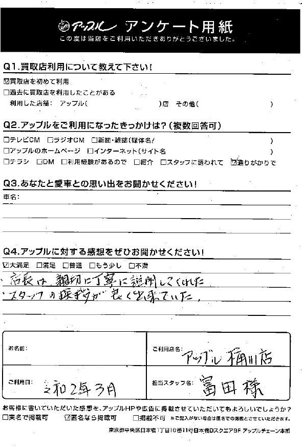 お車のご相談・ 査定だけでもOK! カンタン 入力 30秒 アップルがブランド買取始めました! お電話でも受付中! 受付時間9:30 ~ 19:00 048-783-2474 お車のご相談・ 査定だけでもOK! カンタン 入力 30秒 アップルがブランド買取始めました! お電話でも受付中! 受付時間9:30 ~ 19:00 048-783-2474 アップルがブランド買取始めました! お電話でも受付中! 受付時間9:30 ~ 19:00 048-783-2474 店舗情報 在庫車 スタッフ紹介 ブログ お客様の声 キャンペーン 無料査定 click お客様の声 ご記入日: 2020/03/29 K様 車名:トヨタ プリウス(2023年3月~のPHVを含む) ・アップルに対する感想店長は親切に丁寧に説明してくれた。スタッフの挨拶が良く出来ていた。 前へ 次へ お客様の声一覧を見る