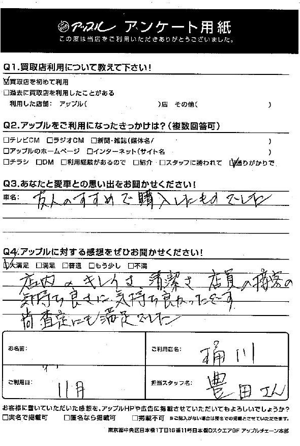 お車のご相談・ 査定だけでもOK! カンタン 入力 30秒 アップルがブランド買取始めました! お電話でも受付中! 受付時間9:30 ~ 19:00 048-783-2474 お車のご相談・ 査定だけでもOK! カンタン 入力 30秒 アップルがブランド買取始めました! お電話でも受付中! 受付時間9:30 ~ 19:00 048-783-2474 アップルがブランド買取始めました! お電話でも受付中! 受付時間9:30 ~ 19:00 048-783-2474 店舗情報 在庫車 スタッフ紹介 ブログ お客様の声 キャンペーン 無料査定 click お客様の声 ご記入日: 2020/11/15 F様 車名:フォルクスワーゲン ポロ ・あなたと愛車の思い出友人のすすめで購入したものでした。・アップルに対する感想店内のキレイさ、清潔さ、店員の接客の気持ち良さに、気持ち良かったです。尚査定にも満足でした。 前へ 次へ お客様の声一覧を見る