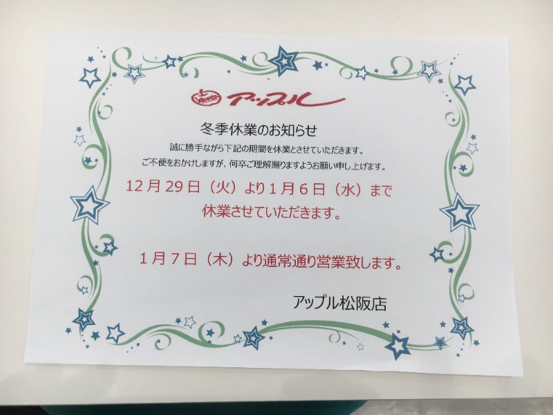 お車のご相談・ 査定だけでもOK! カンタン 入力 30秒 アップルがブランド買取始めました! お電話でも受付中! 受付時間10:00 ~ 19:00 0598-51-0070 お車のご相談・ 査定だけでもOK! カンタン 入力 30秒 アップルがブランド買取始めました! お電話でも受付中! 受付時間10:00 ~ 19:00 0598-51-0070 アップルがブランド買取始めました! お電話でも受付中! 受付時間10:00 ~ 19:00 0598-51-0070 店舗情報 在庫車 スタッフ紹介 ブログ お客様の声 キャンペーン 無料査定 click [ 未分類 ] 2020/12/25 (金) 13:33 年末年始休業のお知らせ 〈店長の阿部でございます〉皆さんお元気ですか?今年もあと少しですね。アップル松阪店の年末年始の休業のお知らせです。2020年12月29日から2021年1月6日までお休みをいただきます。今年は新型コロナウイルスでなかなか外出も出来ず大変でしたね。来年はコロナが終息し皆さんと楽しい年になるよう祈っております。今年もあと少しですがアップル松阪店では最後まで元気に頑張っていきます。皆様のご来店を心よりお待ちしております。 2020-12-25 13:33:45 新しい記事へ 古い記事へ 最新記事 年末年始休業のお知らせです。営業時間変更のお知らせです。夏季休業のお知らせです。アップル松阪店 グランドオープン店舗移転のお知らせ 店舗情報に戻る 月別アーカイブ 2025年12月(2)2025年08月(1)2025年02月(2)2024年12月(1)2024年08月(1)2024年04月(1)2023年12月(1)2023年08月(1)2023年04月(1)2023年01月(1)2022年12月(2)2022年08月(1)2022年04月(1)2022年01月(1)2021年12月(1)2021年08月(1)2021年03月(1)2020年12月(3)2020年11月(2)2020年09月(2)2020年08月(1)2020年04月(1)2020年01月(1)2019年12月(1)2019年08月(2)2019年07月(2)2019年05月(1)2019年04月(2)2019年03月(2)2019年02月(1)2019年01月(1)2018年12月(4)2018年11月(12)