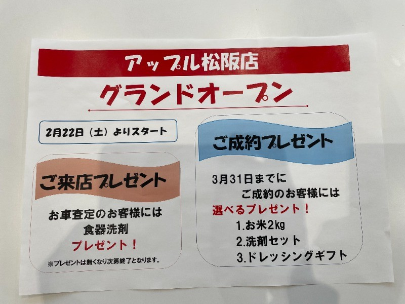 お車のご相談・ 査定だけでもOK! カンタン 入力 30秒 アップルがブランド買取始めました! お電話でも受付中! 受付時間10:00 ~ 19:00 0598-51-0070 お車のご相談・ 査定だけでもOK! カンタン 入力 30秒 アップルがブランド買取始めました! お電話でも受付中! 受付時間10:00 ~ 19:00 0598-51-0070 アップルがブランド買取始めました! お電話でも受付中! 受付時間10:00 ~ 19:00 0598-51-0070 店舗情報 在庫車 スタッフ紹介 ブログ お客様の声 キャンペーン 無料査定 click [ 未分類 ] 2025/02/21 (金) 18:14 アップル松阪店 グランドオープン (店長の阿部でございます)明日2月22日(土)10時よりグランドオープン致します。ご来店査定プレゼント、ご成約プレゼントをご用意しております。キャンペーンも同時に行っております皆様のご来店をスタッフ一同、心よりお待ちしております。 2025-02-21 18:14:30 新しい記事へ 古い記事へ 最新記事 年末年始休業のお知らせです。営業時間変更のお知らせです。夏季休業のお知らせです。アップル松阪店 グランドオープン店舗移転のお知らせ 店舗情報に戻る 月別アーカイブ 2025年12月(2)2025年08月(1)2025年02月(2)2024年12月(1)2024年08月(1)2024年04月(1)2023年12月(1)2023年08月(1)2023年04月(1)2023年01月(1)2022年12月(2)2022年08月(1)2022年04月(1)2022年01月(1)2021年12月(1)2021年08月(1)2021年03月(1)2020年12月(3)2020年11月(2)2020年09月(2)2020年08月(1)2020年04月(1)2020年01月(1)2019年12月(1)2019年08月(2)2019年07月(2)2019年05月(1)2019年04月(2)2019年03月(2)2019年02月(1)2019年01月(1)2018年12月(4)2018年11月(12)