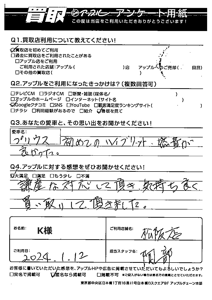 K様 車名:トヨタ プリウス(2023年3月~のPHVを含む)